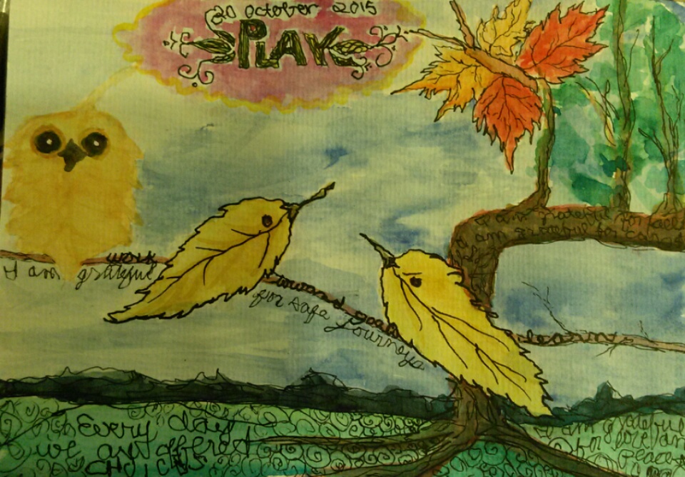 However the important part of this post is “My Dream of You”. That title really grabbed me. It touched my heart, my soul, my psyche. I had meant to use the book’s pages, which are yellowed, to art collage. Somehow, I could not bear to cut up the pages especially the title on the top of each page. I never knew why it resonated so but it finally came to me this morning as I photographed a pile of art supplies laying on my counter top (that needed to be put away). The title popped in to my head and with it came a feeling of being enfolded in warmth and love. At once I was struck with the reality of living a dream. Thanks to the man in the upper right hand corner of the photograph , my honey Brent McFarland, I am able to live this dream. My days are spent in the forest, watching our chickens and feeding them, spending time with our puppy and creating art. (I do other things also, like dishes laundry, housework, yard work and things of that ilk but who needs to hear about that, right?) I was given this gift almost a year ago and I have learned about peace through art by studying meditation, art and mindfullness, time spent alone and with others of like mind and creating an art that changes daily. This art is the drug soothes my savage beast. Whenever I feel unsettled or out of sorts I turn to art to settle me. Thanks to art, I have no need to worry about side effects, drug interactions and the cost of drugs.